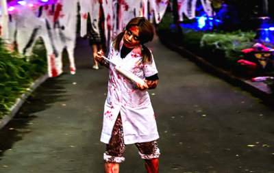 앞이 보이지 않는 안개 속에서의 극강의 공포를 극복 해야하는 죽음의 숲:데드포그와 좀비들의 거리 행진 퍼포먼스 좀비 트레인 퍼레이드, 좀비러쉬로 오감을 자극하는 오싹한 하루를 보낼 수 있습니다.